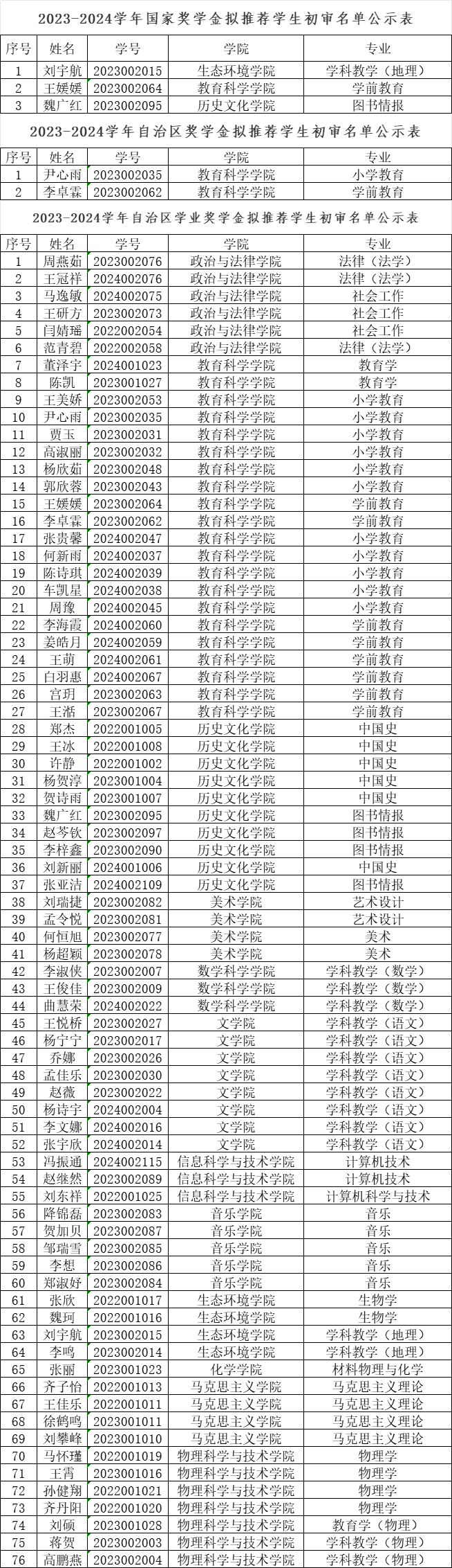 根据《财政部 教育部 人力资源社会保障部 退役军人部 中央军委国防动员部关于印发<学生资助资金管理办法>的通知》(财教〔2021〕310号)《教育厅关于下达2024年普通高等学校学生资助补助经费预算的通知》和《关于做好2024年普通高校本专科生各项奖助学金及材料报送工作的通知》《包头师范学院研究生国家奖学金管理办法(试行)等五个文件的通知》(包师发〔2014〕97号)等文件精神,经过个人申请、各研究生培养单位审核公示、学生工作部复核等程序,现将2023-2024学年研究生国家、自治区各类奖学金拟推荐学生初审名单予以公示。