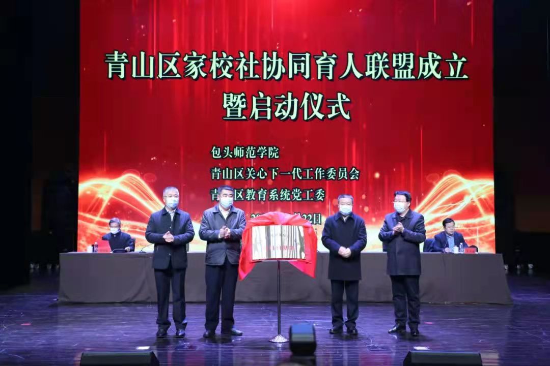 包头师范学院党委书记王永明,市教育局党组书记、局长张文科,区委副书记、政法委书记、关工委名誉主任、教育系统党工委书记李培文,区政府副区长李文杰共同为“家校社协同育人联盟——包头师范学院教科研基地”揭牌,并聘请我校教师教育学院院长郝红英、教育科学学院副院长刘俊英、教师吴晓艳为专家指导组成员。