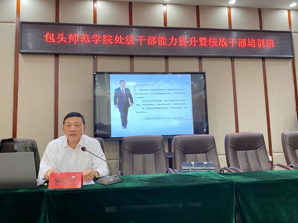 党委副书记施纪华在开班仪式上作动员讲话,代表学校党委对全体参训干部提出要求,并以《新时代新担当新作为》为题做了专题报告。培训紧紧围绕学习习近平总书记重要讲话、干部担当作为、高等教育高质量发展、干部管理监督、统战和民族工作以及铸牢中华民族共同体意识、“四史”教育等六个主题展开,以视频讲座辅导课、读书报告会、学习交流研讨、专题辅导报告、视频自学、现场互动教学、观看专题影片等形式对干部们开展了专题教育。