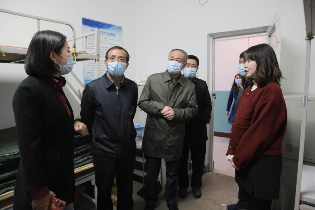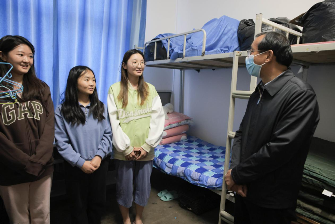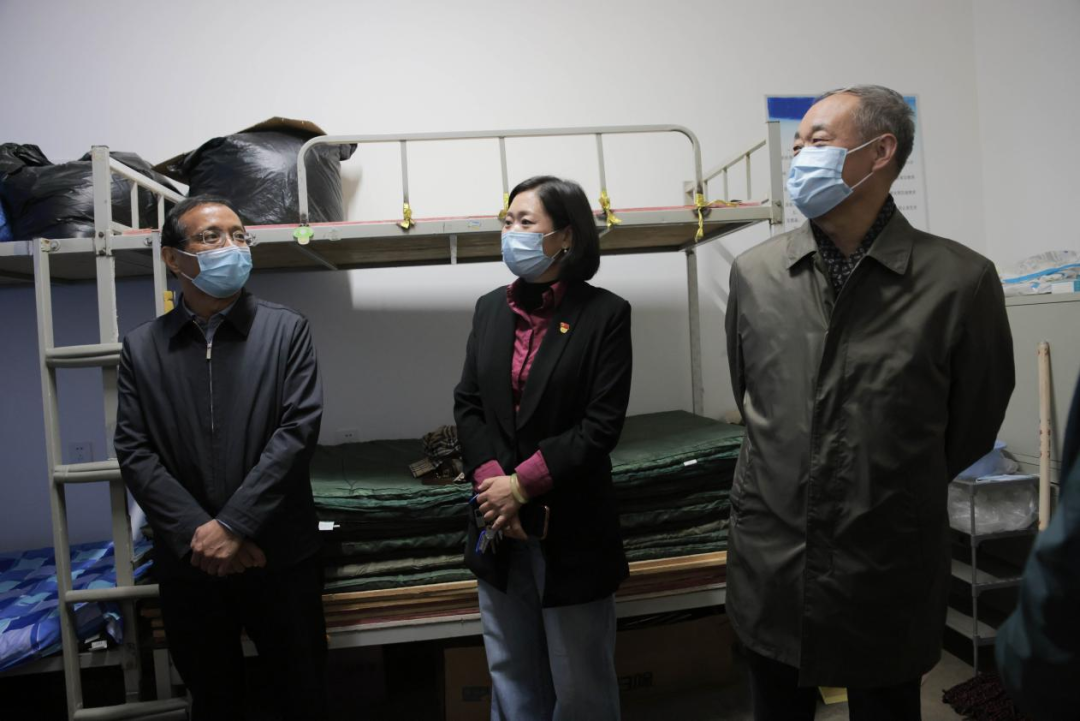 在学生公寓,校领导走访了与学生同吃同住的辅导员老师临时住所,悉心了解老师们在校生活、工作的情况,了解疫情防控期间学生教育管理工作的实际,共同探讨工作方案,给出具体指导。同时看望在校学生,询问大家学习生活情况,叮嘱同学们在疫情期间要做好防护,要遵守学校疫情防控要求,精诚团结,相互信任配合,和学校一起共克时艰,以形成共抗疫情的坚强防线。勉励同学们要以学习为重,以实际行动努力克服疫情带来的影响,爱国爱校,勇于担当奉献,争做优秀的新时代青年。