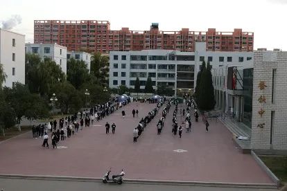 同学们自觉排成竖列,保持一米间距,有序进行核酸检测。