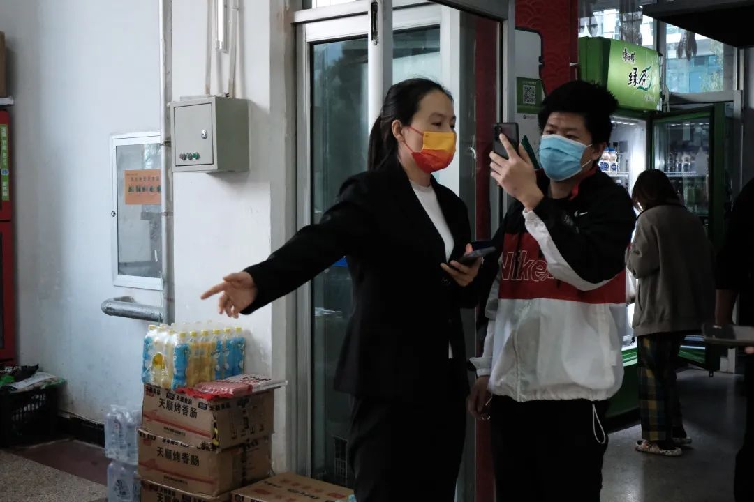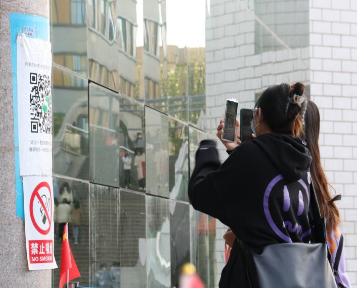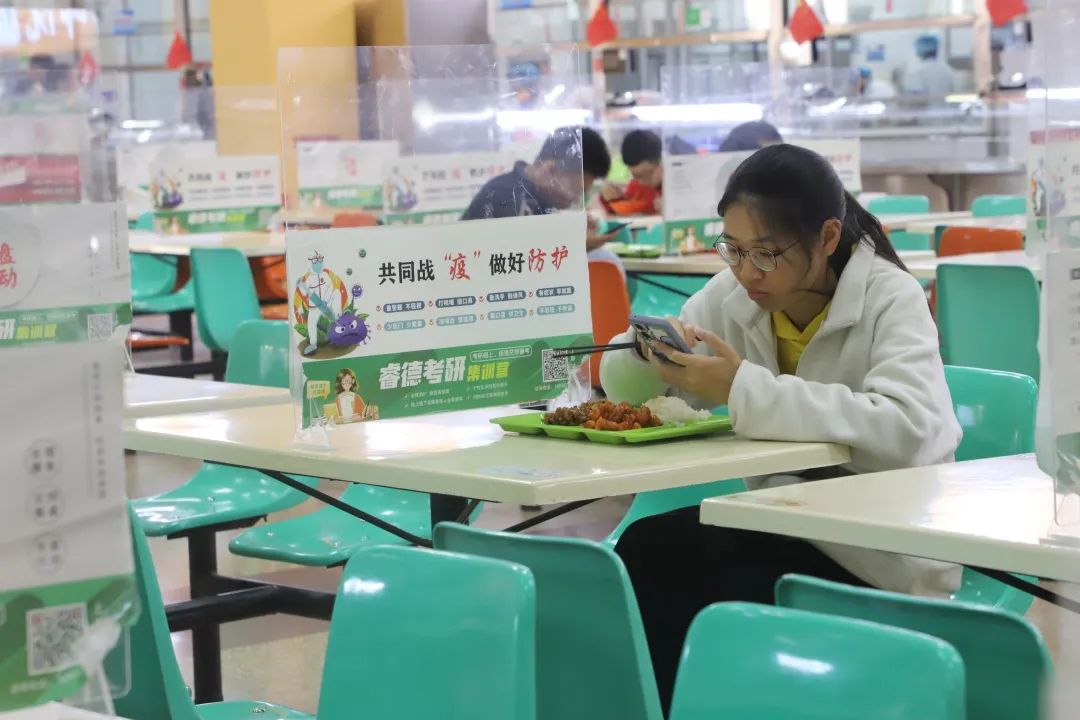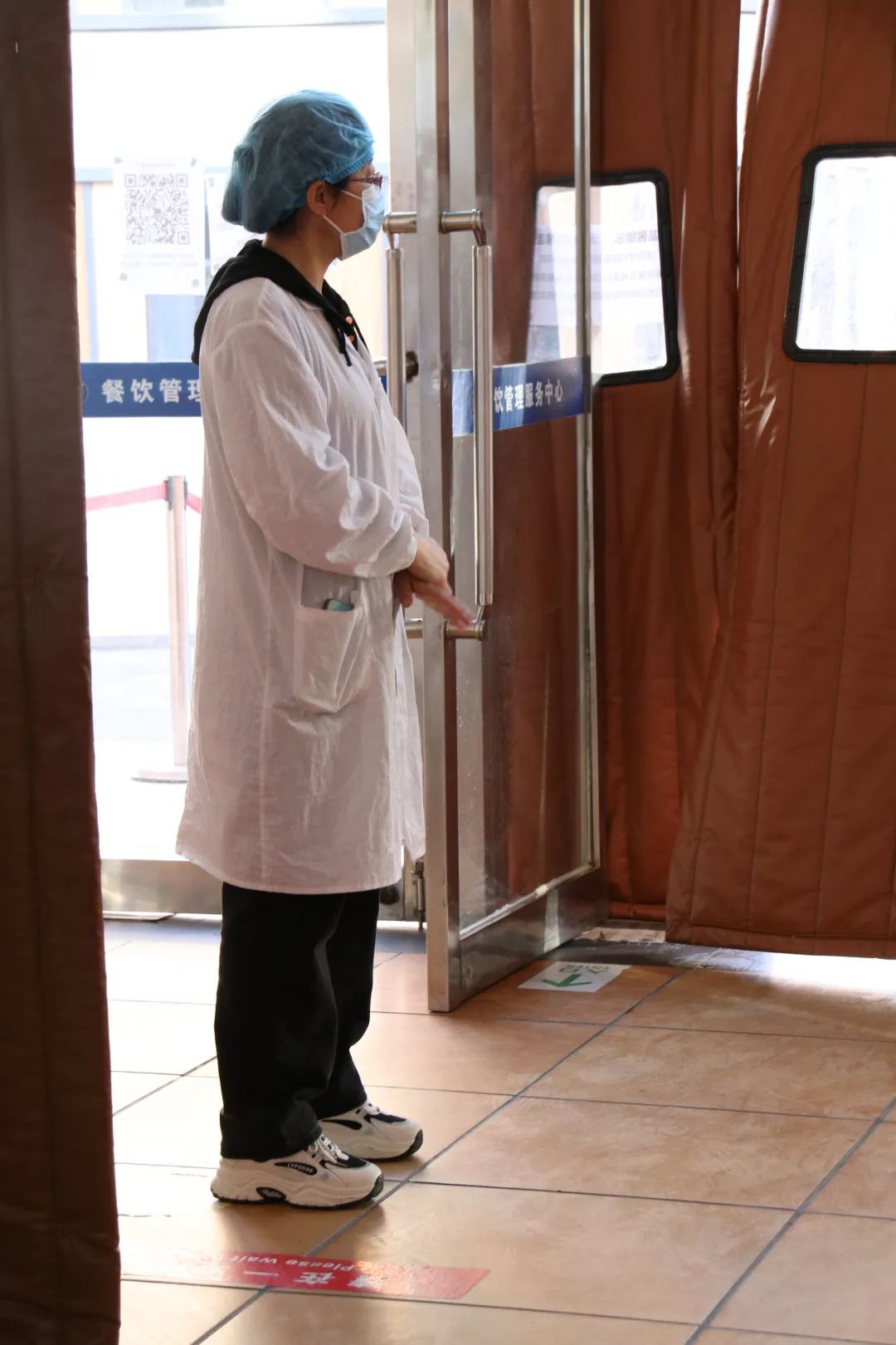 志愿者守好餐厅入口关,同学们遵守规则扫场所码进入就餐。