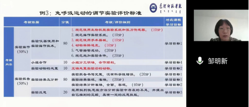 邹明新老师以思政元素的特征为切入点,以任教的人体解剖生理学课程为例,通过融入、考核、成效和改进四个方面动情分享了思政教育的教学实施方法和心得体会,表示思政教育需要落实在实践中去,要培养学生树立正确的生命观念,善待实验动物,用生物学科思想理解自然观、可持续发展观,提升对生命和自然界的认识。