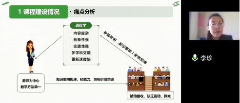 李珍老师以激发学习动力,构建FCBPI教学模式为主题,从遗传学课程建设情况、课程改革情况、感悟和反思三个方面,通过分析课程痛点问题深刻阐明了教学改革的重要性,提出课程改革措施并详细说明如何设计构建FCBPI教学模式,讲解了教师在专业课教学中针对FCBPI模式的实施运行与评价体系,并给出了具体方法和学习建议。
