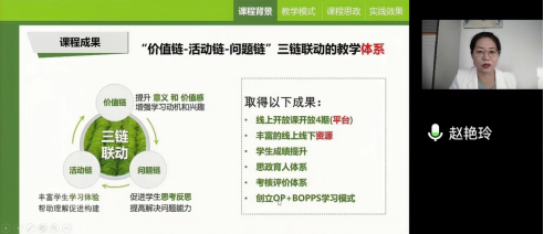 赵艳玲老师分析了植物学课程建设的背景,面向全校教师详细介绍了如何聚焦教学目标,创新应用教学模式,包括基于BOPPS平台和五星教学法创立“价值链-活动链-问题链”三链联动的教学体系,并形成OP+BOPPS学习模式,引导学生利用教师提供的在线任务导图和学习资源进行自主学习,最后强调要转换教学理念,将课程育人放在首位,在日常教学中持续营造零星思政氛围,建立学生良好的科学思维和社会责任感。