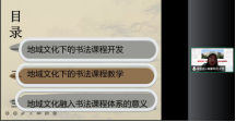 李慧连老师以“地方文化视野下的书法专业课程的开发与实践”为题,谈如何将地域文化特色与书法进行有机结合。通过资料搜集、田野考察等方式对自治区特色文化资源进行开发,并以情景教学法、趣味教学法等方式将地域文化元素融入书法课堂,使学生在学习书法的同时感受民族文化的多样性,产生民族自豪感,树立文化自信。宋安东老师以思政元素的特征为切入点,以任教的唐楷技法与实践课程为例,通过分析书法课程培养目标与面临困境阐明目前教学现状,运用“三挖掘”的方式深入发掘书法课程思政元素,并创造性地提出“四变革”,构建课程思政全链条,为课程思政融入艺术学类课程提供参考。