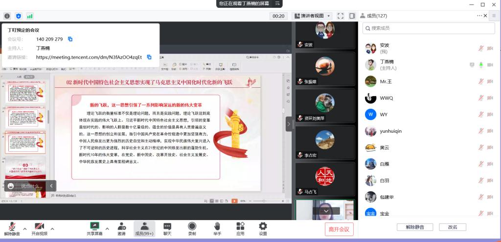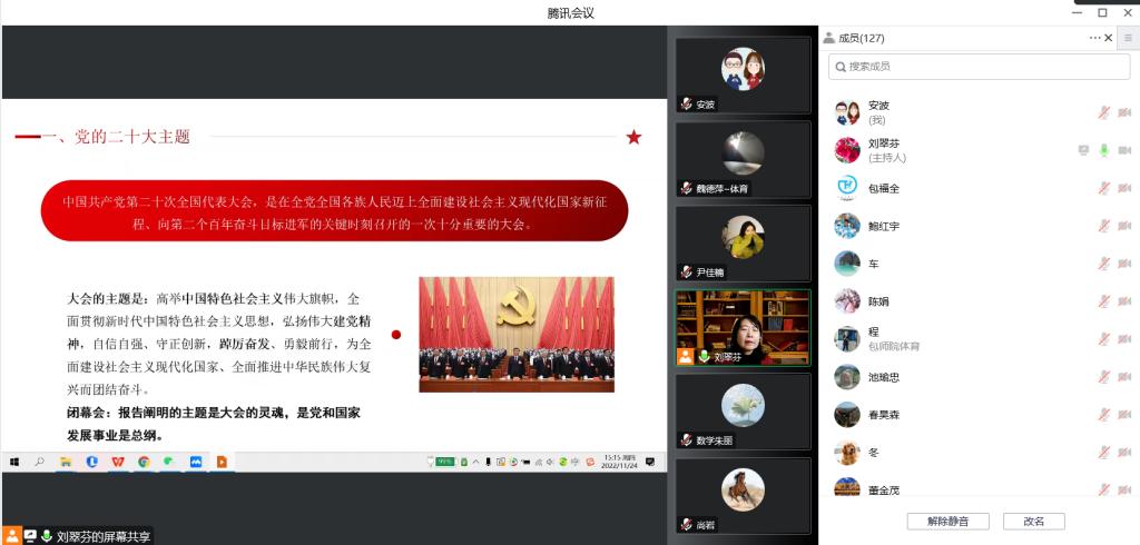 为引导全校广大教职工深入理解“九个深刻领会”“五个牢牢把握”“三个全面”“七个聚焦”等方面的重要要求,准确把握党的二十大提出的一系列重要思想、重要观点、重要战略、重要举措,真正把思想和行动统一到党的二十大精神上来,把智慧和力量凝聚到落实党的二十大确定的目标任务上来,根据《中共包头师范学院委员会关于深入学习宣传贯彻党的二十大精神的通知》《关于开展党的二十大精神巡讲活动的通知》安排部署,11月24日,我校通过腾讯会议平台为全校教职工进行了第一轮宣讲。