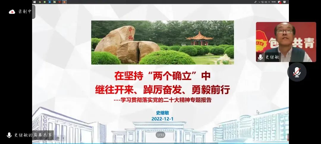 本次讲座由我校纪委委员、美术学院党总支书记、副研究员史继敏老师主讲。史继敏老师以《在坚持“两个确立”中继往开来 踔厉奋发 勇毅前行》为主题,从党的二十大召开的重大意义开始讲起,深入解读了“两个确立”的提出背景和思想内涵,从“继往”和“开来”两个方面提出必须坚持“两个确立”。会上,史老师为同学们解读了党的二十大精神中与同学们联系紧密的5个学习重点,号召同学们把坚决拥护“两个确立”转化为坚决做到“两个维护”的思想自觉、政治自觉、行动自觉,深入贯彻落实党的二十大精神和中央决策部署,为全面建设社会主义现代化国家、全面推进中华民族伟大复兴而团结奋斗。