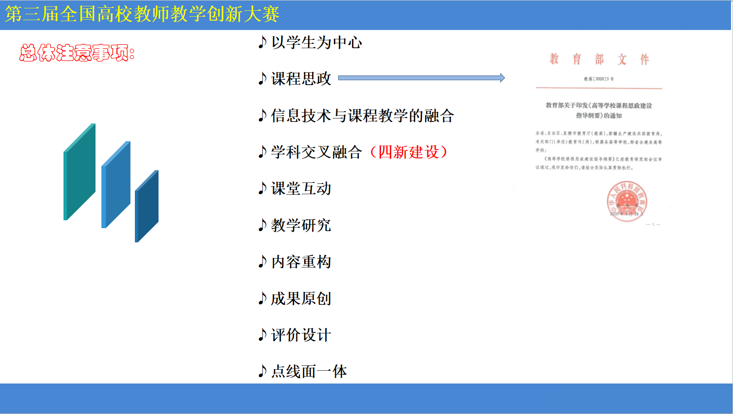 袁秀利主任梳理了历届教师教学创新大赛的规则内容,回顾了历届我校教师的参赛情况,解读了本届大赛的最新要求。他从课堂教学实录视频、教学创新成果报告、教学设计创新汇报三个方面,通过解析本届大赛评分标准深刻阐明了“四新”建设、课程思政、信息技术教育教学融合等大赛要求的关键点,对人才培养、课程建设的内涵做了深入的分析。