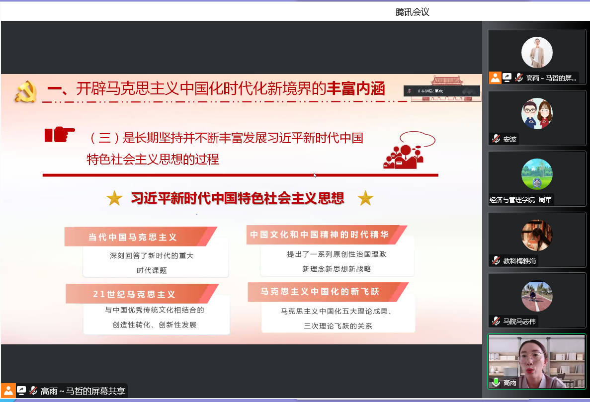 马克思主义学院教师孟蕾为教职工三班作了“理论创新向未来:开辟马克思主义中国化时代化新境界”的讲座,从“党的百年历史就是一部不断推进马克思主义中国化时代化的历史”“习近平新时代中国特色社会主义思想实现了马克思主义中国化时代化新的飞跃”“在践行‘六个必须坚持’中谱写马克思主义中国化时代化新篇章”三个方面的内容指出,奋进新征程,我们所面临问题的复杂程度、解决问题的艰巨程度明显加大,要增强学习贯彻习近平新时代中国特色社会主义思想的政治自觉,思想自觉,行动自觉,更好的把坚持马克思主义和发展马克思主义统一起来,让马克思主义在中国大地上展现出更强大、更有说服力的真理力量。