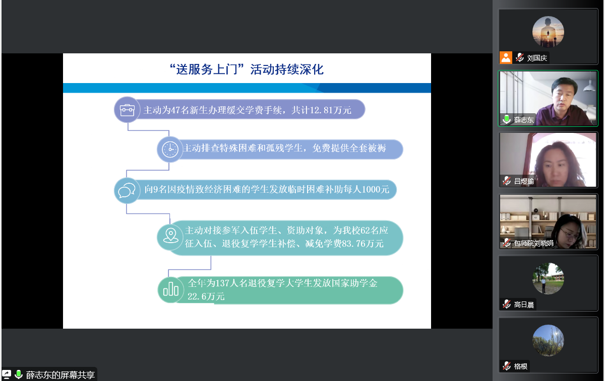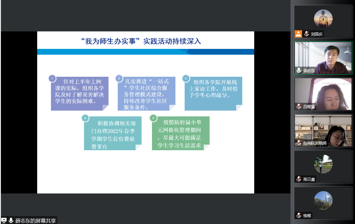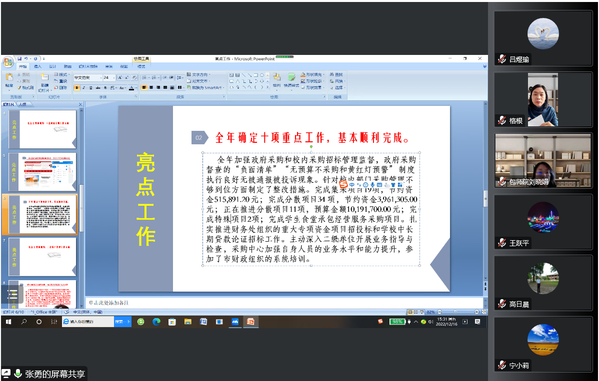 12月16日下午,校党委委员、副校长格根哈斯召集分管的职能部门召开2022年亮点工作总结汇报会。各相关职能部门负责人参加了会议,会议以线上方式召开。