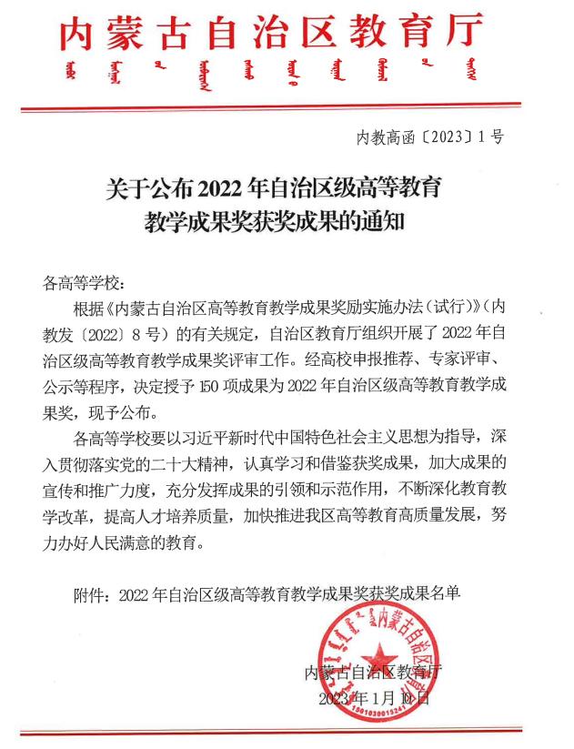 近日,内蒙古自治区教育厅发布了《关于公布2022年自治区级高等教育教学成果奖获奖成果的通知》(内教高函〔2023〕1号),公布了2022年自治区级教学成果奖获奖名单,我校荣获自治区级教学成果奖6项。其中,一等奖1项、二等奖4项、三等奖1项。