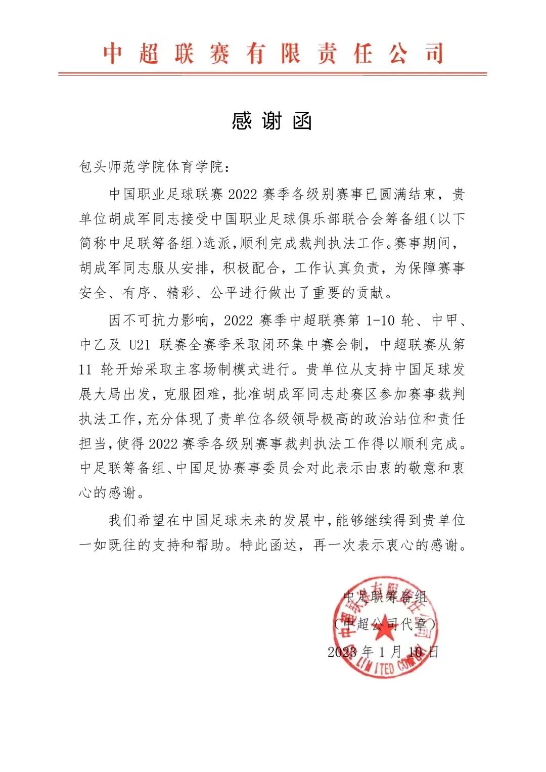 近日,中足联筹备组向我校体育学院发来感谢函,对体育学院教师胡成军支持赛事工作,全力保障赛事,顺利完成裁判执法工作给予了充分肯定并表示感谢,同时胡成军老师也在今年中国足球超级联赛执法场次达到100场。