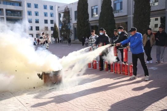 上午9点15分,参演人员利用烟雾弹模拟14号学生公寓楼多处起火,楼道内烟雾弥漫,消防应急预案立即启动,指挥员下达疏散命令后,各楼层参演学生,在消防科负责人、保安人员及学生综治联盟队员的引导指挥下,用湿手帕、湿毛巾等捂住口鼻, 弯腰沿疏散通道迅速有序疏散,在公寓楼前集合,清点人数,并安排工作人员搜楼。随后,包头市消防救援支队青山区大队张啸队长对应急疏散演练活动进行了总结,并带领现场学生前往学子广场讲解了消防器材的原理和使用方法,在场学生进行了灭火演练。此外,部分有参加消防救援工作意向的毕业年级学生对消防队招聘工作进行了咨询。