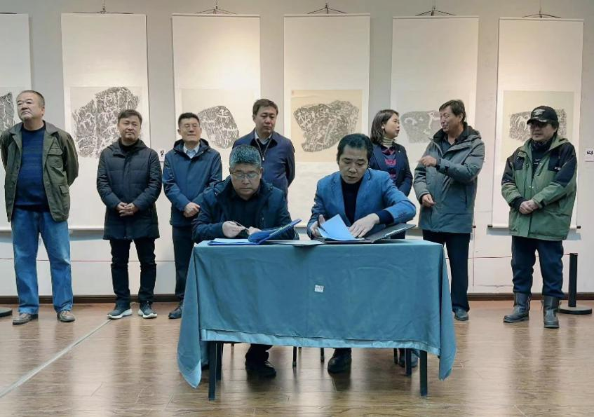 阿拉善盟文物保护研究中心向我校捐赠了阿拉善岩画拓片,阿拉善盟文创文化传播有限公司与我校美术学院签订了战略合作意向书,双方就未来在推进中华优秀传统文化研究、弘扬北疆文化多元的文化样态、提高大学生对民族文化艺术的传承与保护上达成合作共识。未来,双方将为推进文化自信积极开展北疆地区石刻艺术文化的艺术作品创作和美育教育实践与宣传,以实际行动为传承和保护中华优秀传统文化做贡献。