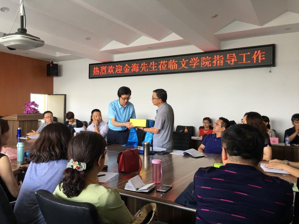金海教授肯定了文学院教师的科研进取精神和取得的成果,同时也希望我校教师在推动文化强区战略中取得更大的成绩。(文学院)