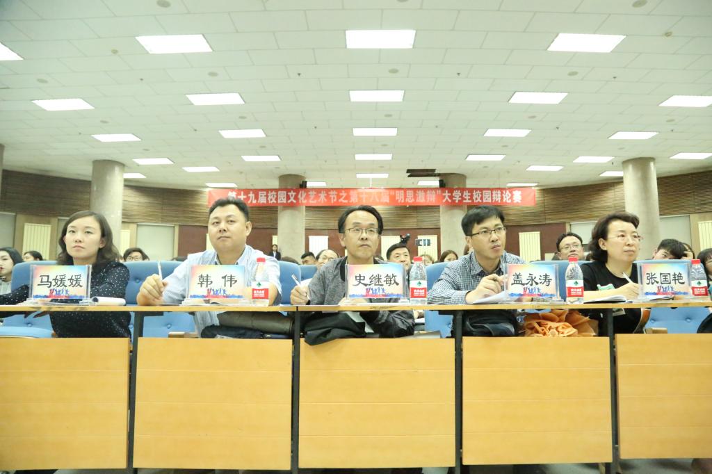 5月11日晚,我校第十九届校园文化艺术节之第十八届“明思激辩”大学生校园辩论赛在学术报告厅落下帷幕。校党委委员、副院长施纪华、团委副书记刘晓娟、相关学院分管学生工作领导、团总支书记、辅导员及学生代表500余人观看了比赛。化学学院党总支书记史继敏、保卫处处长盖永涛、党委宣传部副部长韩伟、马克思主义学院教研室主任张国艳及马克思主义学院马媛媛,共五位老师担任决赛的评委。