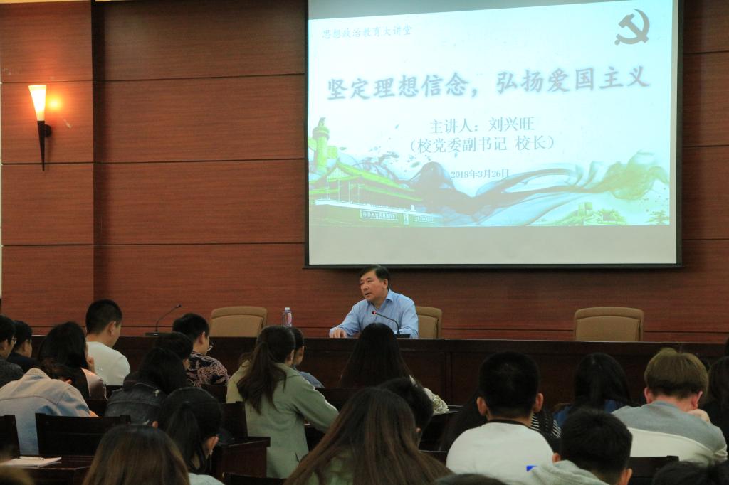 为加强大学生思想政治教育,大力弘扬爱国主义精神,传承中华民族传统美德,3月26日下午,校党委副书记、院长刘兴旺在图书馆会议厅为物理科学与技术学院学生作了题为“坚定理想信念,弘扬爱国主义”的思想政治教育专题讲座。