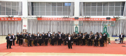 12月7日,由教育厅主办,包头师范学院协办的“内蒙古自治区2016年高雅艺术进校园活动”在包头铁道技术学院正式启动,随后活动在包头医学院和包头职业技术学院陆续展开。“高雅艺术进校园”是由教育部、文化部、财政部以“走进大师、感受经典、陶冶情操、提高修养”为主题组织开展的活动,旨在落实《中共中央国务院关于进一步加强和改进大学生思想政治教育的意见》关于“进一步推进高雅文化进校园活动,丰富校园文化生活,提高学生艺术修养”的要求。本次活动中,我校爱乐梦想交响管乐团演出的节目大都是享誉中外的经典作品,如Van McCoy作曲《非洲交响》、根据邓丽君经典歌曲改编的管乐作品《空港》和《千言万语》、经典和震撼的电影音乐《星球大战》以及民族作品《蒙古族祝酒歌》等,加上萨克斯重奏乐团和大树爵士大乐队的精彩表演,为鹿城学子展示了交响管乐的无限魅力。