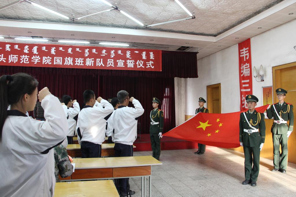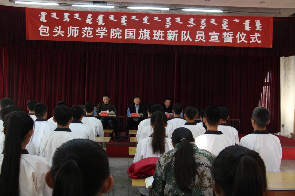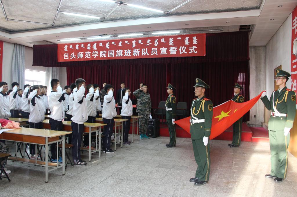 仪式上,尚海涛部长宣读了学生工作部(武装部)对国旗班班长的《任命通知》和《批准2016级41名同学为国旗班队员的决定》;国旗班班长刘子涛就新队员的集训、考核、选拔工作进行总结;41名新队员面向国旗进行了庄严宣誓,新队员代表吴昴男做了发言。