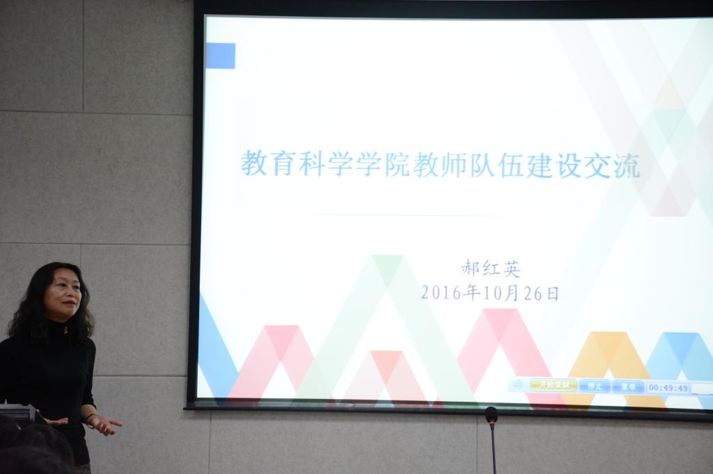 最后,郝红英院长做了教育科学学院教师队伍建设交流的报告。她对教育科学学院教师队伍进行了分析,指出了教师队伍的优势与存在的问题,并介绍了教育科学学院教师队伍建设的举措以及发展。