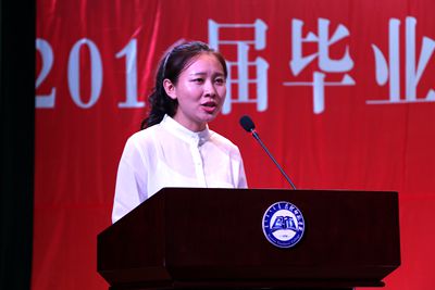 文学院12级新闻本科1班杨晓娟代表全体毕业生发言,深情回顾了大学四年学习生活点点滴滴的美好回忆,表达了对母校、老师、同学的感恩、留恋、祝福之情。