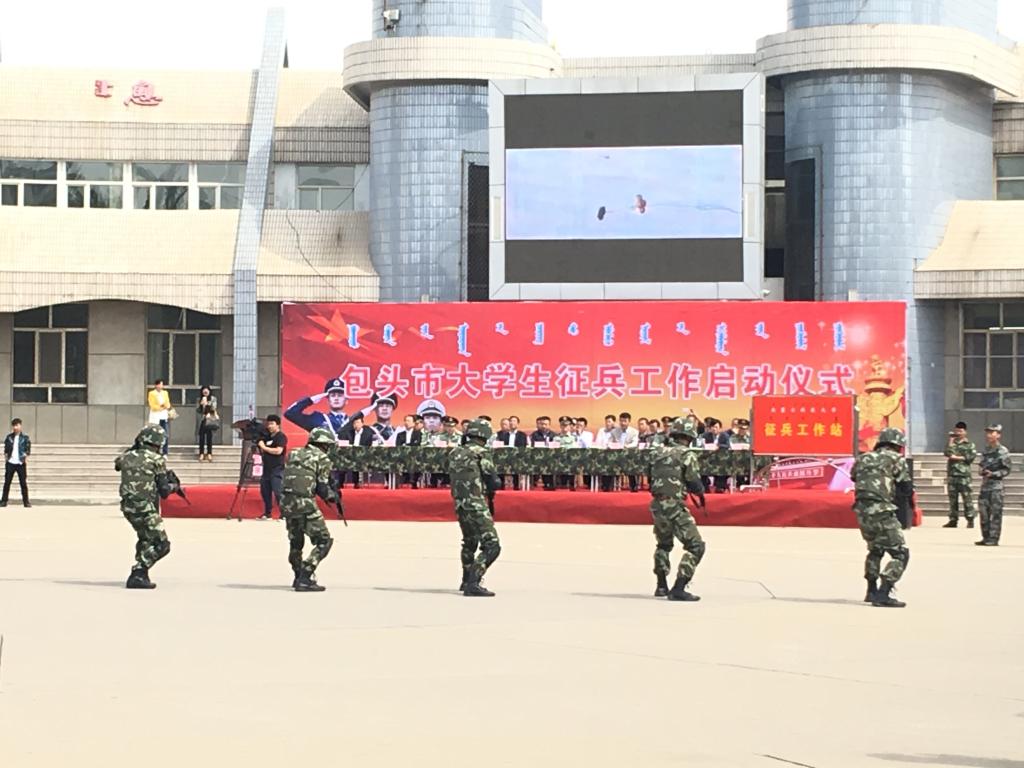 为了贯彻落实教育部、军委国防动员部视频会议和自治区教育厅、内蒙古军区电视会议关于加强大学生征兵工作精神,5月24日上午,包头市大学生征兵启动仪式在内蒙古科技大学举行。包头市政府、包头军分区、各旗县区武装部、包头地区7所高校的相关领导及400余名大学生代表参加了仪式。我校领导施纪华、学生工作部(武装部)部长尚海涛、李胜强老师、赵雪晶老师及50名学生代表参加了启动仪式。