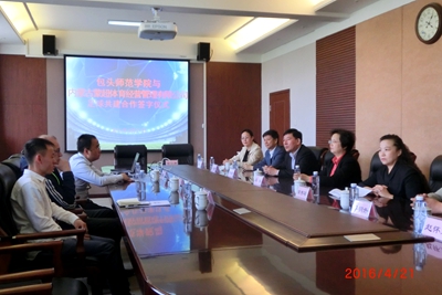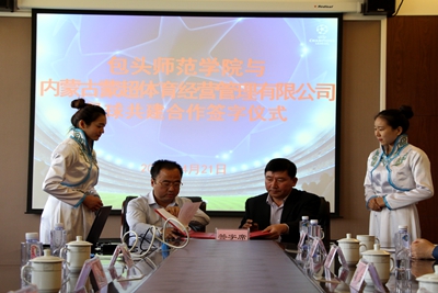 4月21日下午,我校与内蒙古蒙超体育经营管理有限公司足球共建合作签字仪式举行。参加本次签字仪式的有包头市副市长乌云、市教育局副局长李建华、市体育局副局长常秀华,内蒙古蒙超体育经营管理有限公司董事长陈海军、副总经理、总教练米罗西、翻译刘伟,包头师范学院院长刘兴旺、体育学院党总支书记李明升、体育学院院长车志宏、赵怀东及体育学院体育教育(足球教学方向)师生共同参加本次签字仪式。