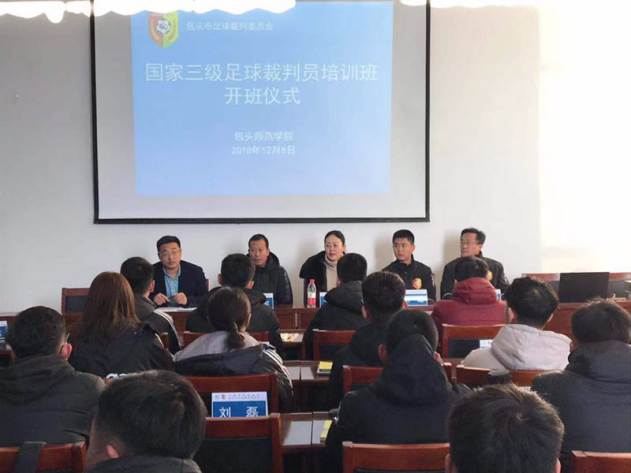 12月8日,由内蒙古自治区足协主办,包头市足球裁判委员会、内蒙古自治区足球协会国家三级足球裁判员培训班在包头师范学院足球教练员、裁判员培训基地开班。本次参加培训学员共计40名,分别来包头市各大学院校。体育学院院长车志宏出席开班仪式,本次培训班邀请现役中国足协超级联赛助理裁判员、内蒙古足球协会裁判讲师胡成军,内蒙古足球协会裁判讲师刘超、张全伟老师担任讲师。