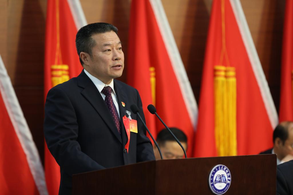 党委书记王永明代表中国共产党包头师范学院第二届委员会向大会作了题为《不忘初心夯基蓄势 牢记使命立德树人 为加快实现学校跨越式发展而努力奋斗》的报告。