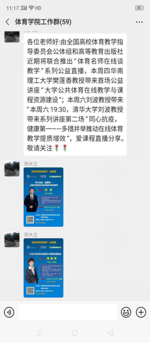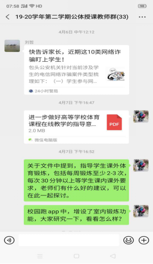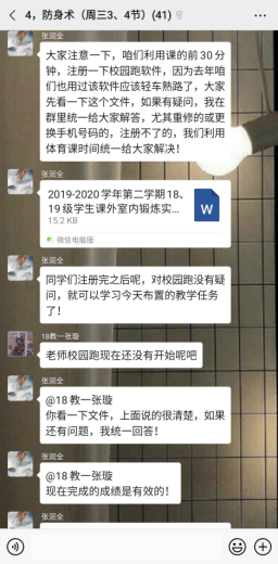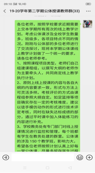 体育学院十分重视体育课程的线上教学工作,为体育课程线上教学提供了大量的教学资源。由于公共体育课程涉及学生数量多班级多,学院还建立了33人的公共体育授课教师群,在群里探讨线上授课方案、交流教学经验、解决学生的各种问题。学院按照学校教务处的线上教学总体要求和具体的教学工作安排,制定了本学期公共体育课程在线教学组织实施方案。老师们明确并统一了线上教学的基本内容和目标。