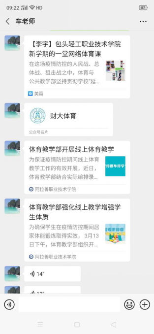 目前。我校共有33名公共体育课程授课教师利用学习通、微信、运动世界校园APP等线上平台授课,每周线上授课300学时。老师们“各显神通”,总结了丰富的线上体育课程教学经验。
