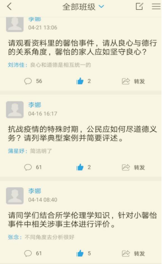 针对老师提前布置的预习任务,借助丰富的教学资源,我能够基本掌握教学内容,疑难问题反馈给老师,能得到老师有价值的指导。系统学习了公共伦理学课程后,收获颇丰。我发现它与我们的生活息息相关,为分析评价道德现象、正确作出道德选择,提升道德修养提供了理论依据,让我们在面对一些道德境遇时能够更加理性,帮助我们树立正确的人生观、价值观,使自己崇善向上,争做新时代有为青年。