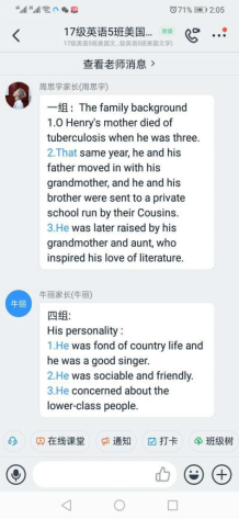 本课程采用微信群,钉钉直播形式开展教学。教师课前在钉钉网盘上传文档、视频、辅助阅读资料,布置小组任务。教学资源主要有课本的电子版资料、甄选出的慕课章节、电子版预习提纲和小组活动任务组成。授课过程分为三个步骤:通过钉钉视频会议分小组讨论进行PAD对分课堂讨论;教师通过钉钉直播(屏幕共享教师答疑文档)解答学生分组讨论后无法解决的问题;教师直播讲解新内容的重难点。有分组任务的章节,学生通过视频会议进行分组讲解,教师点评。根据每周课程特点,教师在钉钉家校本中布置作业,并及时反馈。