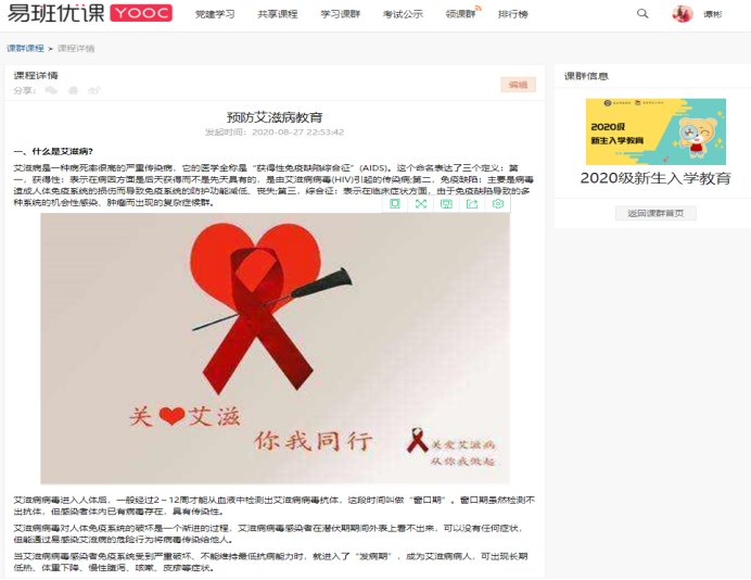 我校已连续三年依托“易班网”平台开展有关艾滋病防治教育、心理健康教育、安全教育、学校规章制度等内容的新生入学教育学习和考试,将入学教育前置,引导新生知校爱校、增强自我保护意识,为入学后的相关教育工作奠定了基础。今年新增了生理卫生知识内容,为帮助广大新生正确认识与了解艾滋病传播途径和生理卫生健康、养成文明健康的生活习惯起到一定的指引作用。(学生工作部)
