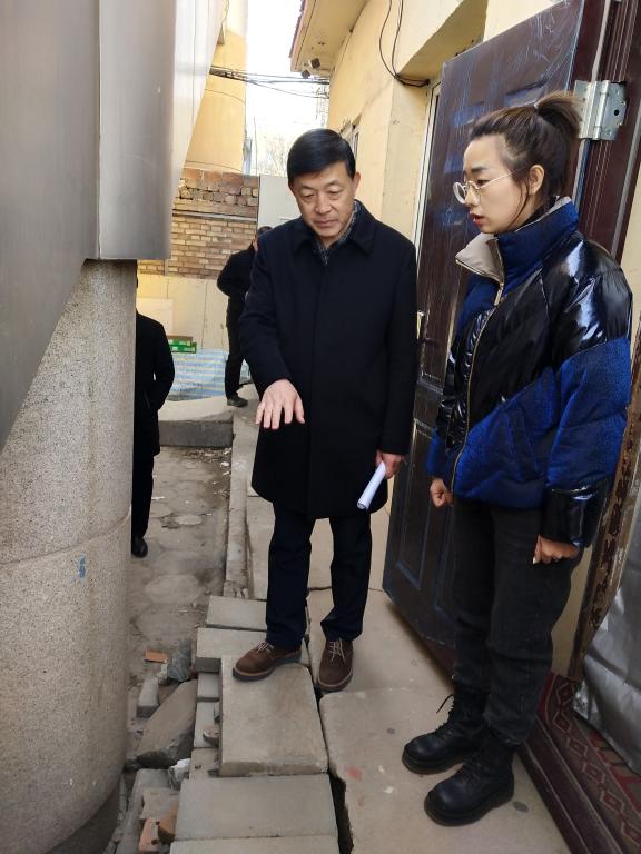 在校区天桥下,他仔细查看了大学生创新创业实践基地入口处搭建的临时台阶,并强调要修缮台阶,坚决去除安全隐患,确保学生安全。
