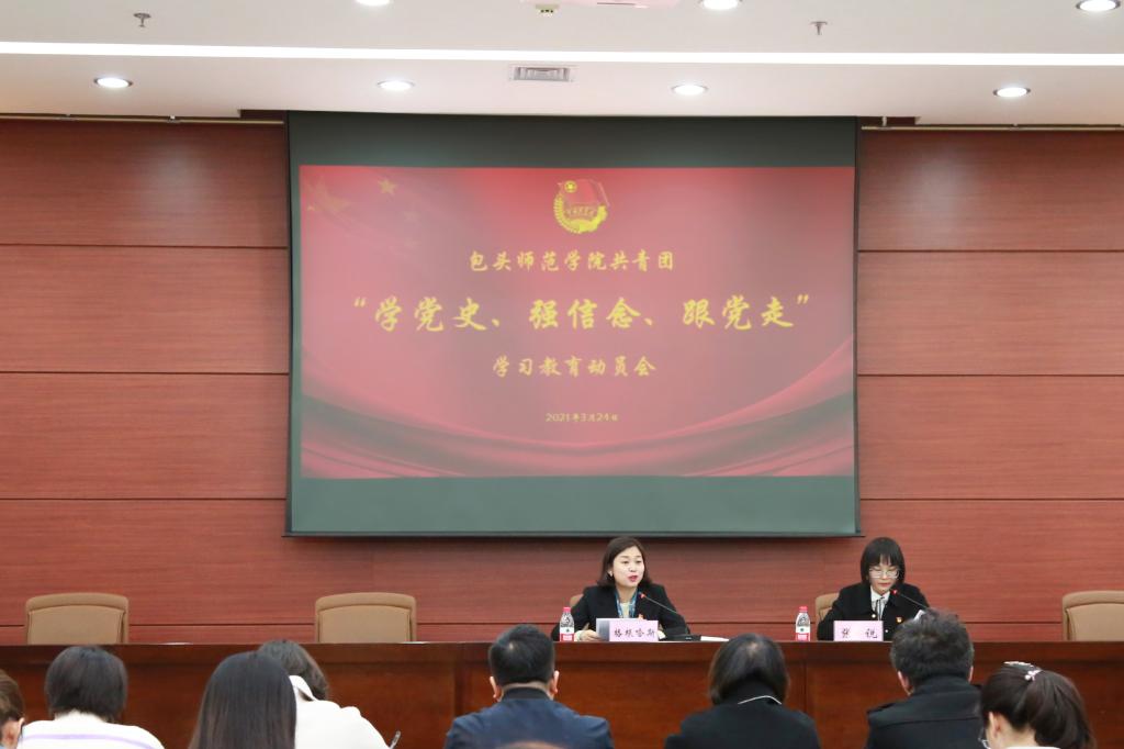 为深入学习贯彻习近平总书记在党史学习教育动员大会的重要讲话精神,按照共青团中央《关于在全团开展“学党史、强信念、跟党走”学习教育的通知》以及校党委关于党史学习教育的安排部署,组织引导全校团员青年扎实开展党史学习教育,3月24日上午,校团委在图书馆会议厅召开了共青团“学党史、强信念、跟党走”党史学习教育动员大会,对在全校各级团组织和团员青年中开展好党史学习教育进行了全面动员和部署。校党委委员、副院长格根哈斯出席并作动员讲话,校团委副书记张锐、二级学院团总支书记、副书记、辅导员及学生代表参加会议。张锐同志主持大会。