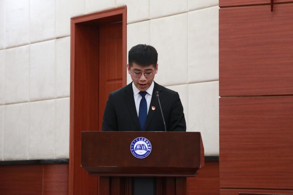 学生代表政治与法律学院团总支副书记王柯道同学做表态发言,展现了包师学子对学好党史、当标杆、作表率的坚定信心。