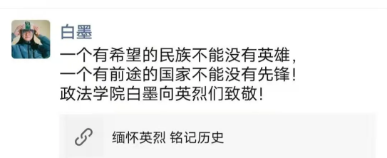清明节到来之际,我校组织开展“祭英烈”主题活动,以此追思先烈,弘扬英烈精神,传承红色基因。通过线上线下祭奠缅怀英烈、重温党史、研讨交流等形式,引导广大青年慎终追远、缅怀先辈,铭记革命先烈光荣事迹,珍惜幸福生活,把先烈们的革命传统和优良作风内化于心、外化于行,薪火相传。