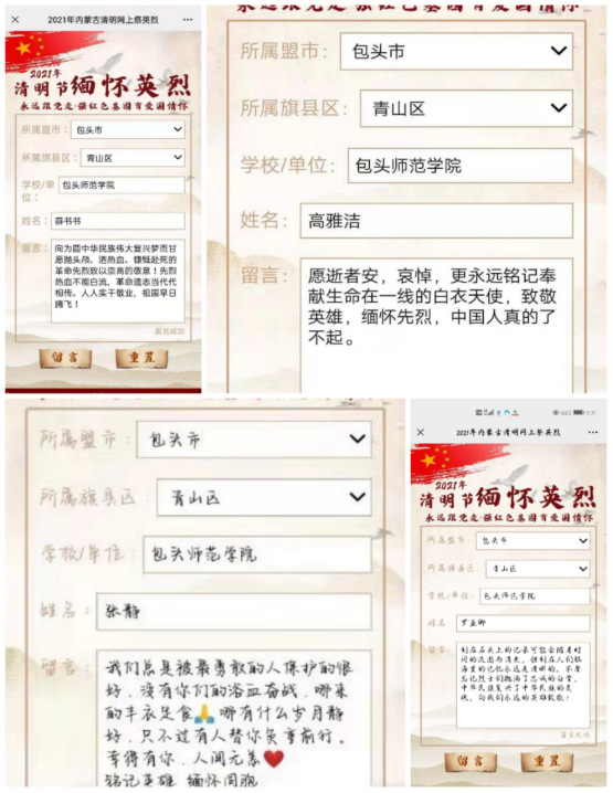 其他二级学院也都开展了形式多样的缅怀革命先烈活动,活动中同学们纷纷表示“历史不能被忘却,英雄值得代代赞颂。我们祭奠英烈,就是要学习先辈们的爱国情怀,将它嵌入到青年一代的灵魂深处,从先烈身上传承信仰的力量,继承先烈遗志,让心中长存浩然之气,让英烈精神薪火相传。吾辈当铭记革命先烈浴血奋战、守卫山河的英雄壮举,我们定将把对革命先烈的追思,转化为奋发进取的动力,为实现中华民族伟大复兴的中国梦而努力奋斗。”(团委)