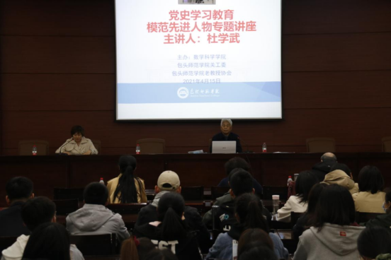 为庆祝中国共产党成立100周年,深入贯彻落实学校党委关于开展党史学习教育的部署要求,我校数学科学学院联合包头师范学院关工委、老教授协会特邀请杜学武教授为全院党员师生、入党积极分子做讲座。离退休处薛红旗处长,关工委副主任关力老师参加讲座。