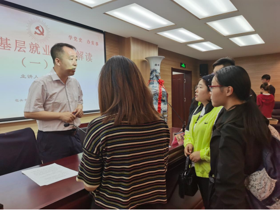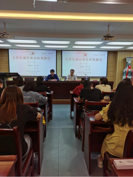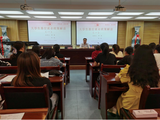 为贯彻落实党中央、国务院“稳就业”“保就业”决策部署,深入开展“学党史、办实事”实践活动,广泛宣传解读国家和我区促进毕业生就业创业的有关政策,努力营造有利于就业创业的良好校园氛围,积极引导我校毕业生树立正确的成才观和就业观,自觉把个人理想同国家社会的需求紧密结合起来,鼓励大学生踊跃到基层锻炼成才,报效祖国。2021年5月19日下午,招生就业处邀请了包头市人社局大学生就业指导服务办公室主任贾勇、副主任李超做了大学生基层项目政策解读专题讲座。各学院负责就业的辅导员老师、大四毕业生以及部分低年级学生参加了讲座,讲座由招生就业处副处长苏海燕主持。