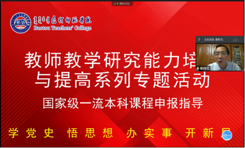 为贯彻我为师生办实事的工作理念,落实教育部“双万计划”的建设要求,切实推动我校一流本科课程建设工作,帮助教师解决课程建设过程中的困惑,6月4日,我校召开一流本科课程申报指导讲座,本次讲座诚邀北京航空航天大学陆士嘉实验室(工信部气动声学重点实验室)主任、教育部流体力学责任教授、博士生导师刘沛清老师和北京师范大学哲学学院教授、博士生导师章伟文老师通过腾讯会议就一流本科课程的建设、申报,为教师作专题讲座,讲座交流会由教务处副处长王骞主持。