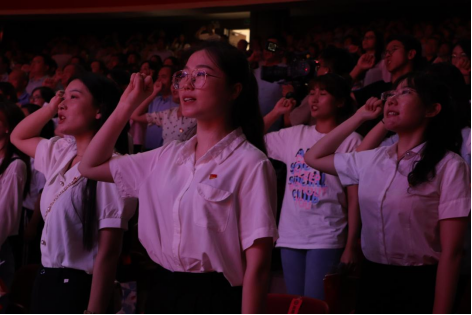 全体党员共同高唱《没有共产党就没有新中国》,党旗挥舞,掌声经久不息。