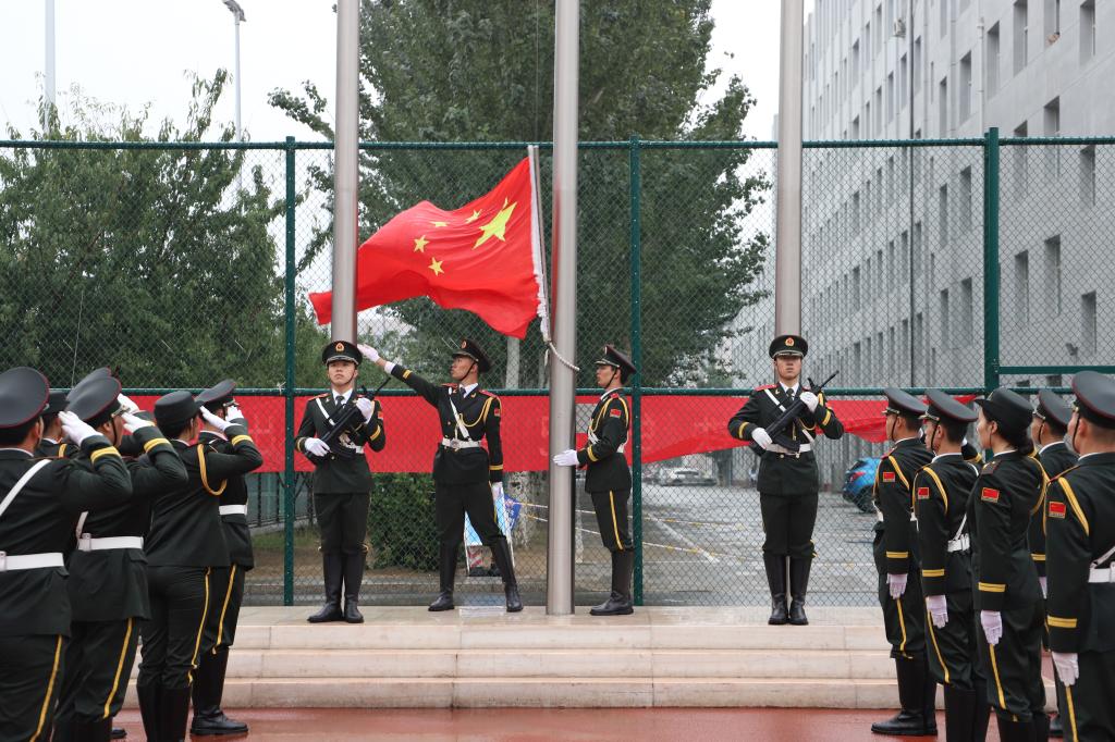 微微细雨中,五星红旗冉冉升起,全体师生庄严肃立,脱帽行注目礼。