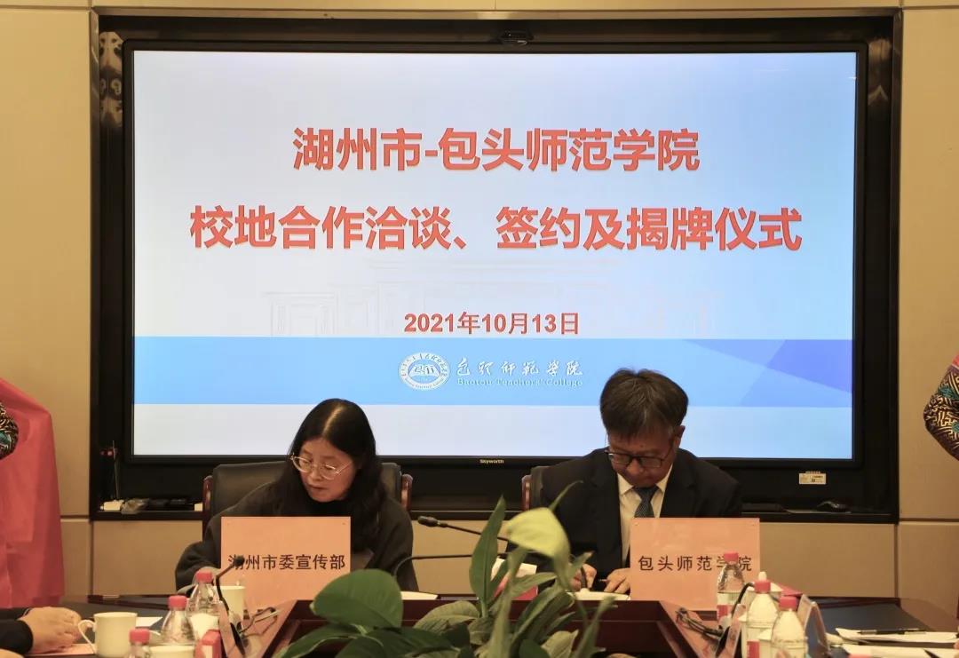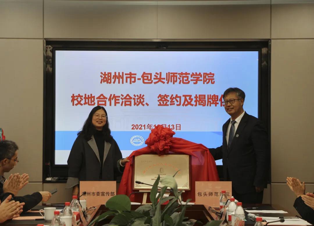 此次签约仪式上,双方共同见证了湖州市文化人才引才基地、湖州市乡村振兴人才引才基地、包头师范学院专业实习基地的揭牌亮相。(招生就业处)