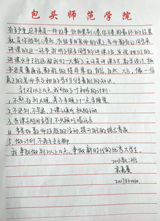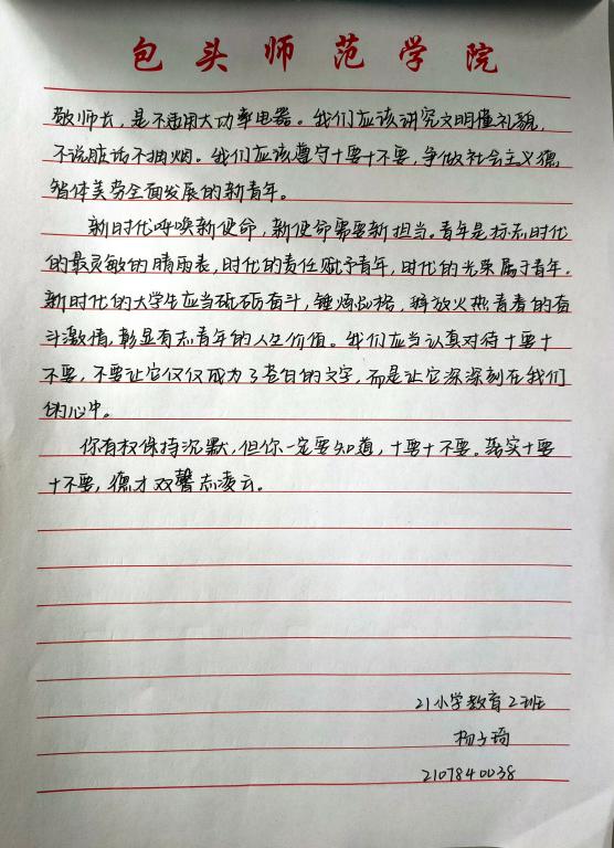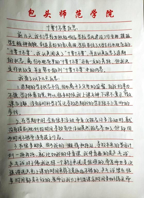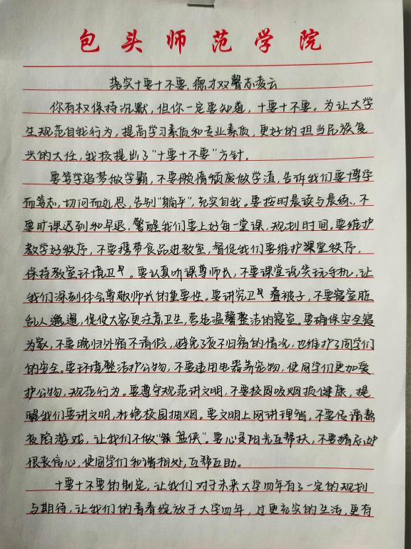 为深入贯彻落实包头师范学院大学生“十要十不要”行为规范,进一步加强教育科学学院学生的学风建设和课堂纪律教育,加深对学校规章制度的认识,强化在校学生遵守校规校纪和安全文明意识,养成良好的行为规范,营造文明和谐的校园环境。教育科学学院学生会素教部于11月4日至11月7日举办“落实十要十不要,德才双馨志凌云”征文活动,旨在引导学生端正学习态度,塑造健全人格。
