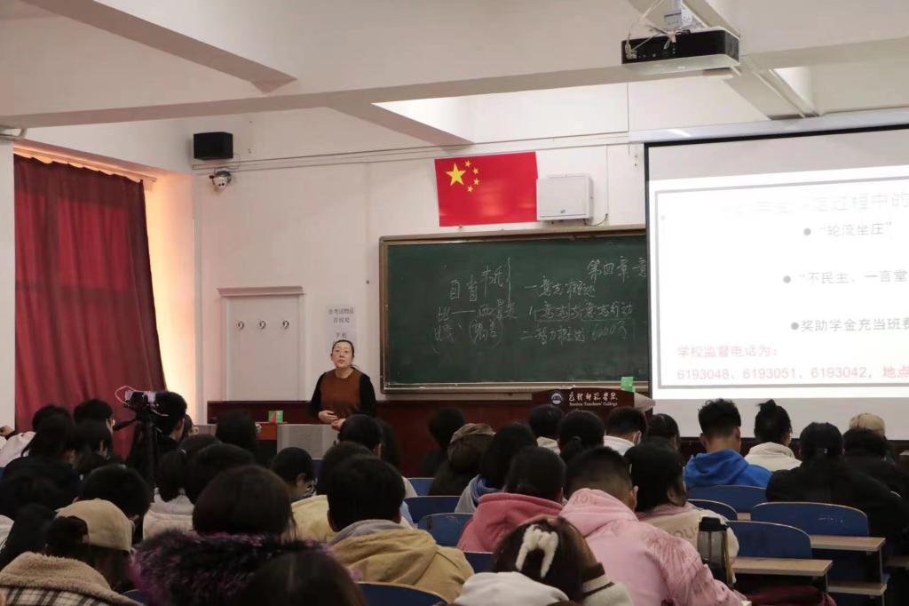 赵雪晶老师从学生资助工作的角度,为新生解读了贫困生认定的详细流程、注意事项等,赵老师强调贫困生认定必须遵守公平公正公开的原则,评议小组在评定贫困生时,既要根据材料又要考虑被评定人员平时的生活作风。讲座中,赵老师就助学贷款、医疗保险等同学们比较关注的问题进行现场答疑。谭彬老师从学生教育管理方面向同学们介绍了学生管理的相关制度,通过评奖评优、违纪解除两个模块帮助同学们深入学习校规校纪,以图文结合的方式层层剖析,引导同学们正确认识校规校纪对于个人成长与发展的重要性。讲座中,谭老师通过校易班推出的包头师范学院大学生行为规范“十要十不要”的情景剧视频,引导学生树立纪律意识,明确学校的管理规定和自己的大学奋斗目标。