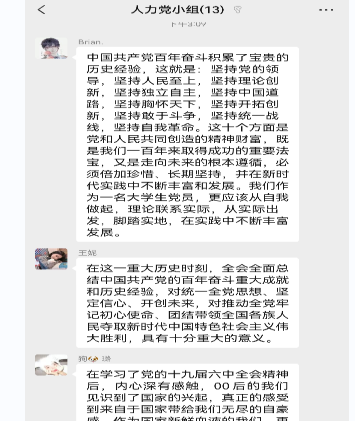 随后,学院教工党支部书记王一冰组织全体教师党员进行深入学习,并交流学习心得。教师党员何欣博士从八个方面讲述自己学习十九届六中全会精神的心得体会,表达了党员对中国共产党的忠诚。教师党员郑钰表示,自己很荣幸能在关键节点加入中国共产党,同时会在课堂上积极地向学生们传达十九届六中全会的精神,与学生们一起见证历史、创造历史。教工党支部书记王一冰总结时勉励教师党员,作为党员,作为人民教师,我们需要培养学生家国情怀,任重而道远,一刻也不能放松。