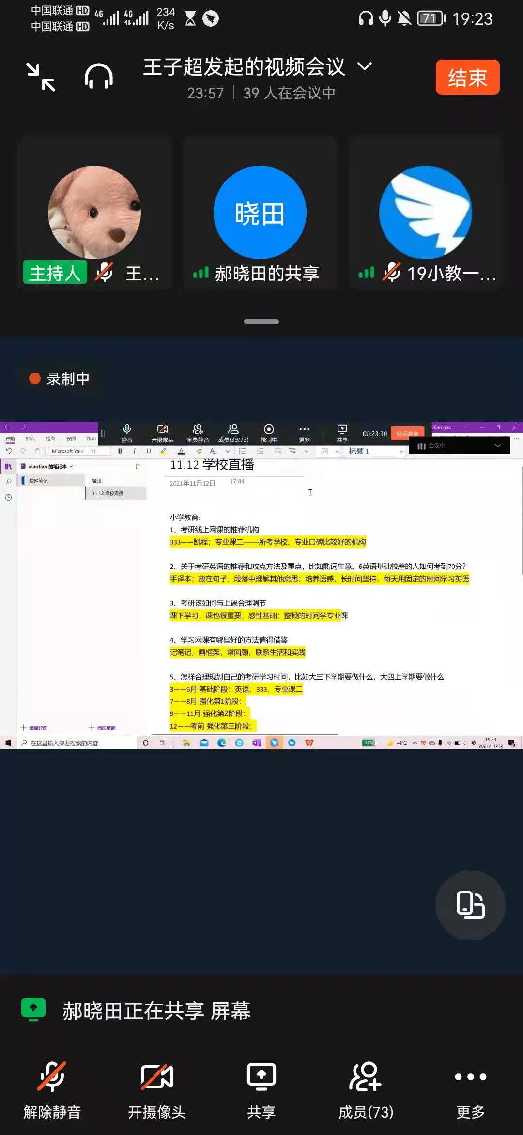 为了增进2018级、2019级同学们对考研政策和内容的了解,明确努力方向,教育科学学院于2021年11月12日晚7:00通过钉钉会议方式分专业举办了线上“考研经验交流会”,交流会邀请学院三个专业共15名考研成功的学长、学姐与同学们分享考研经验,解答考研相关问题。